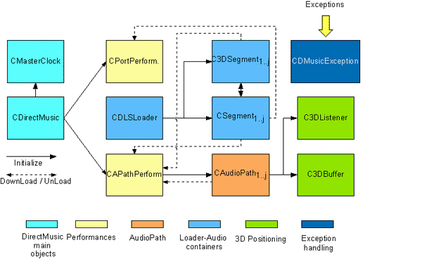 As it happens with the MIDI part of the DirectMidi, the main kernel of the library for audio handling is based on its eleven related classes. They are commented hereafter: