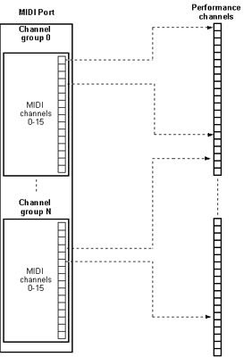 The main problem of a basic system MIDI port like the MIDI Mapper is the limitation of the number of audio channels to 16. This limitation comes from the MIDI standard and extends to modern applications. This limitation is overcome in DirectMusic thanks to the appearance of Peformance channels. The performance channels are similar to MIDI channels except that they are virtually unlimited. Each performance channel contains a single instrument, an instrument coming from a MIDI sequence, a DLS instrument or a waveform. These parts have their own pan, volume and transposition settings. At this point we can state that one performance channel belongs to a single MIDI channel and to a channel group from the port. From now on, when working with performance objects we will always use zero-based performance channels. The chart below explains this relation: